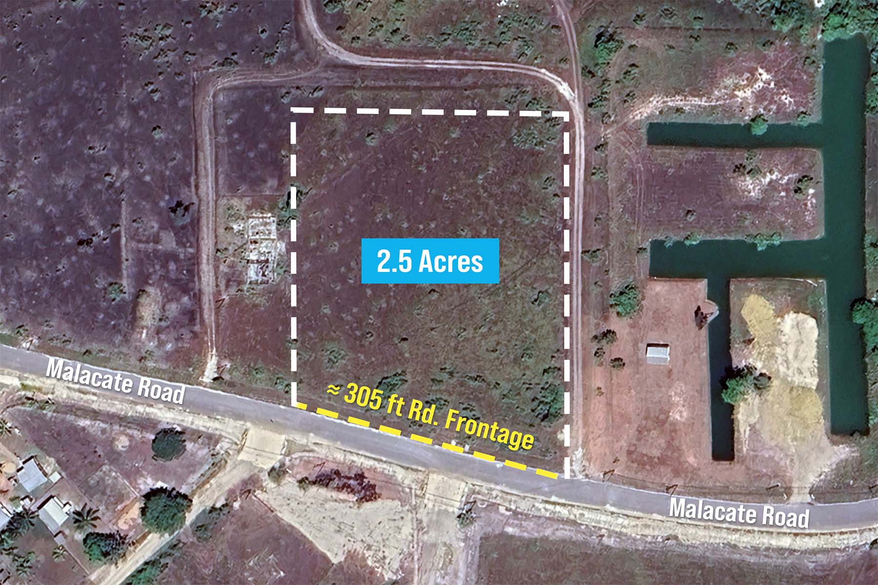 The property features approximately 305 feet of road frontage on Malacate road leading towards the beach, offering easy connection to the main services, shops, and schools within Independence Village. The land is cleared, level, and composed of solid ground, giving future owners a strong starting point for development.