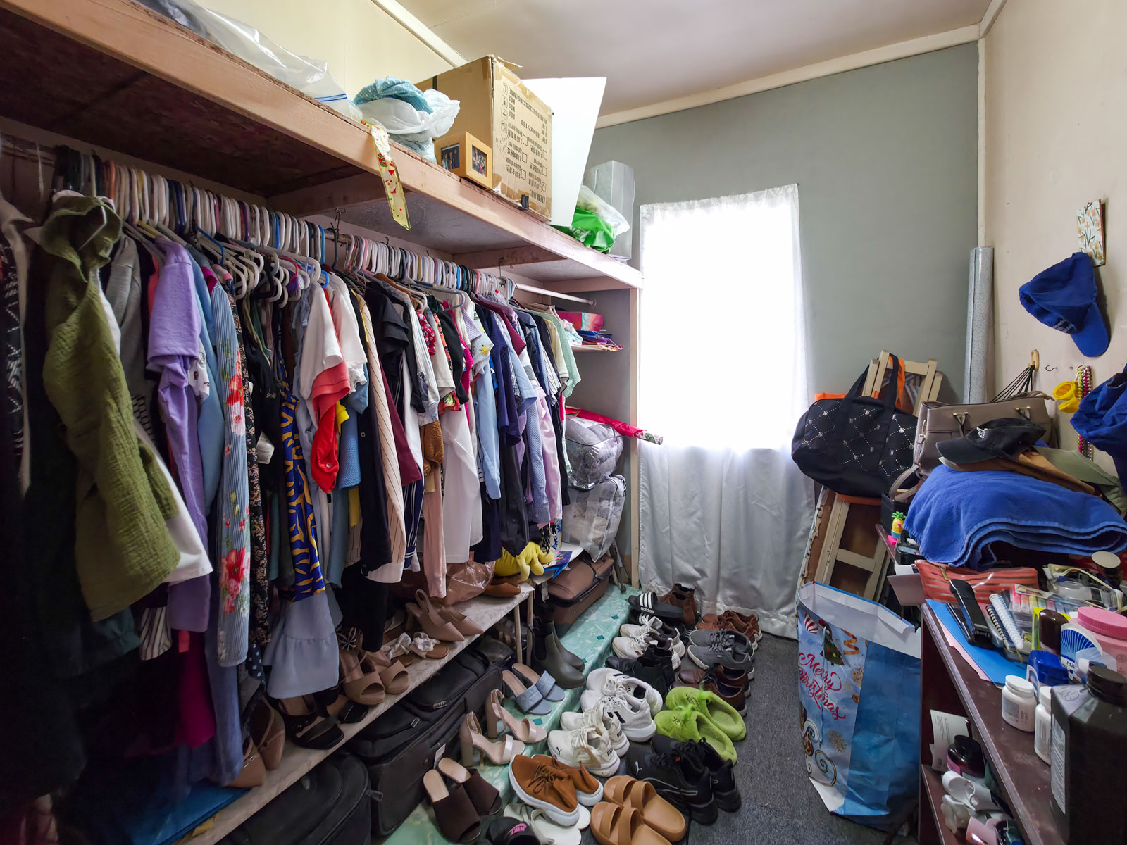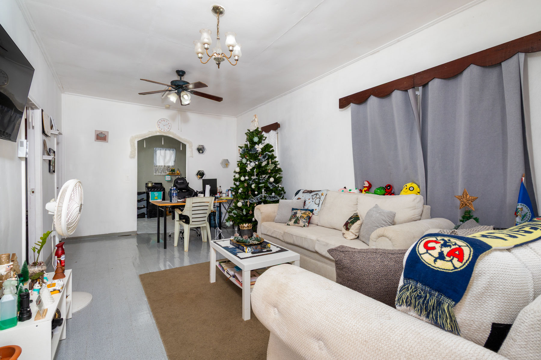 The home features three bedrooms and one bathroom, along with an additional small room currently used as a walk-in closet or storage space. An open living and dining area forms the core of the interior layout, while a separate kitchen is positioned toward the rear of the home. Natural light is present throughout, and the layout allows for renovation or reconfiguration if desired.
