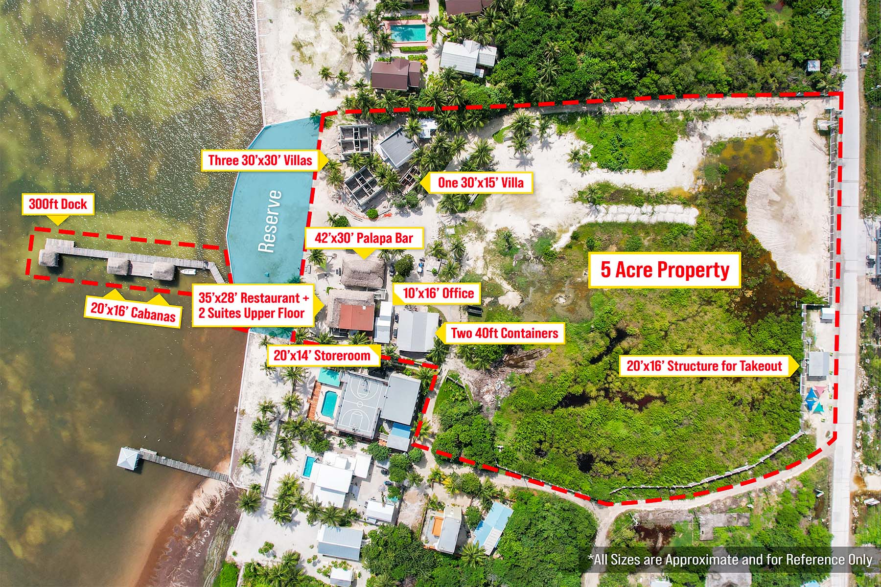 Unique beachfront opportunity on Ambergris Caye — 5 acres with approximately 0.5 acres of beachfront protected by a sea wall. Known locally as Capricorn Restaurant & Bar, this turnkey property combines a fully operational restaurant, dock infrastructure, and villas under construction. Ideal for operators, developers, or investors seeking immediate income and long-term growth.